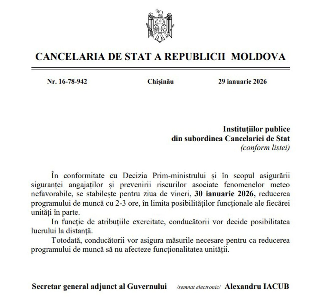 Ziua de vineri, 30 ianuarie, va fi una cu program de muncă mai scurt pentru instituțiile publice din subordinea Guvernului, după ce autoritățile au decis reducerea zilei de lucru cu 2-3 ore. Măsura este aplicată ca prevenție în contextul condițiilor meteorologice nefavorabile prognozate la nivel național.