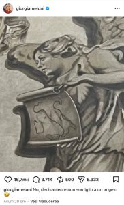 Giorgia Meloni a reacționat pe Instagram, unde a publicat o fotografie a îngerului și a scris: „Nu, cu siguranță nu semăn cu un înger”, adăugând un emoticon care râde.