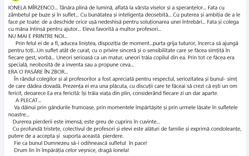 „Va dăinui prin gândurile frumoase, prin momentele împărtășite și prin urmele lăsate în sufletele noastre. Durerea pierderii este imensă, este greu de cuprins în cuvinte”, se arată în mesajul comunității școlare.