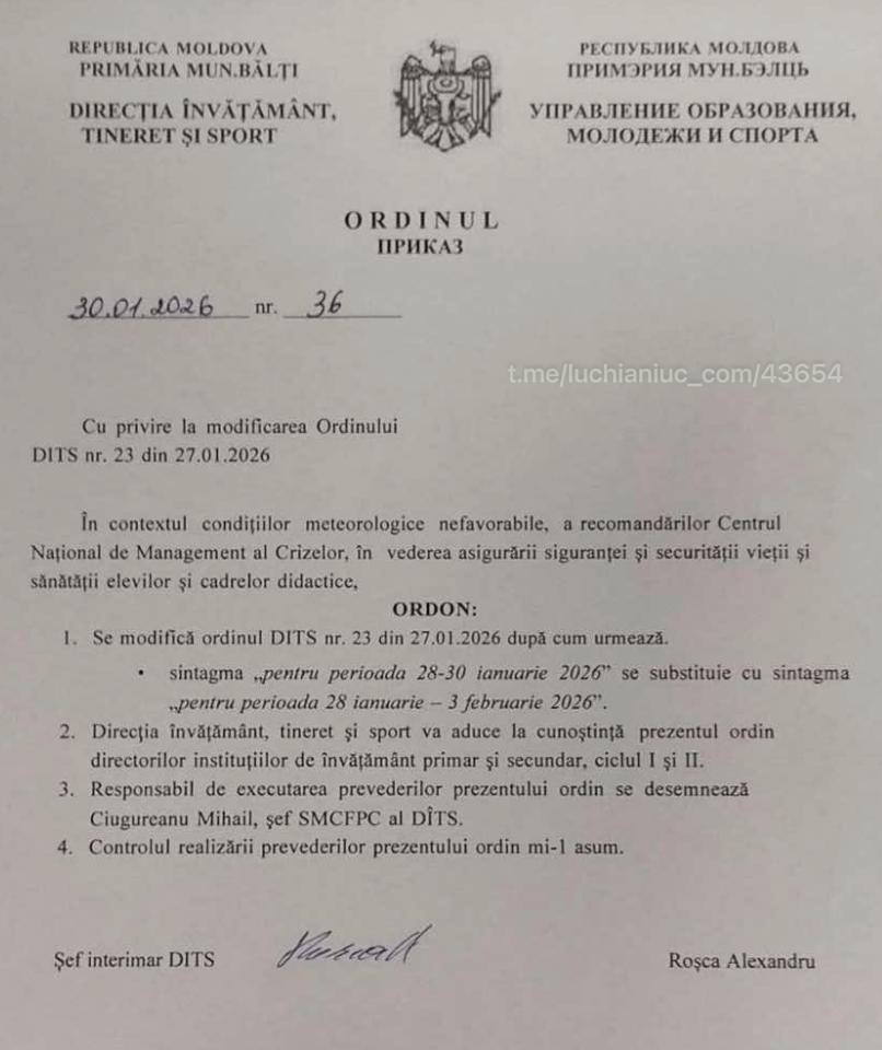 Potrivit documentului, ordinul din 27 ianuarie 2026 a fost modificat, iar perioada pentru care se aplică măsurile speciale a fost extinsă de la „28-30 ianuarie 2026” la „28 ianuarie – 3 februarie 2026”.