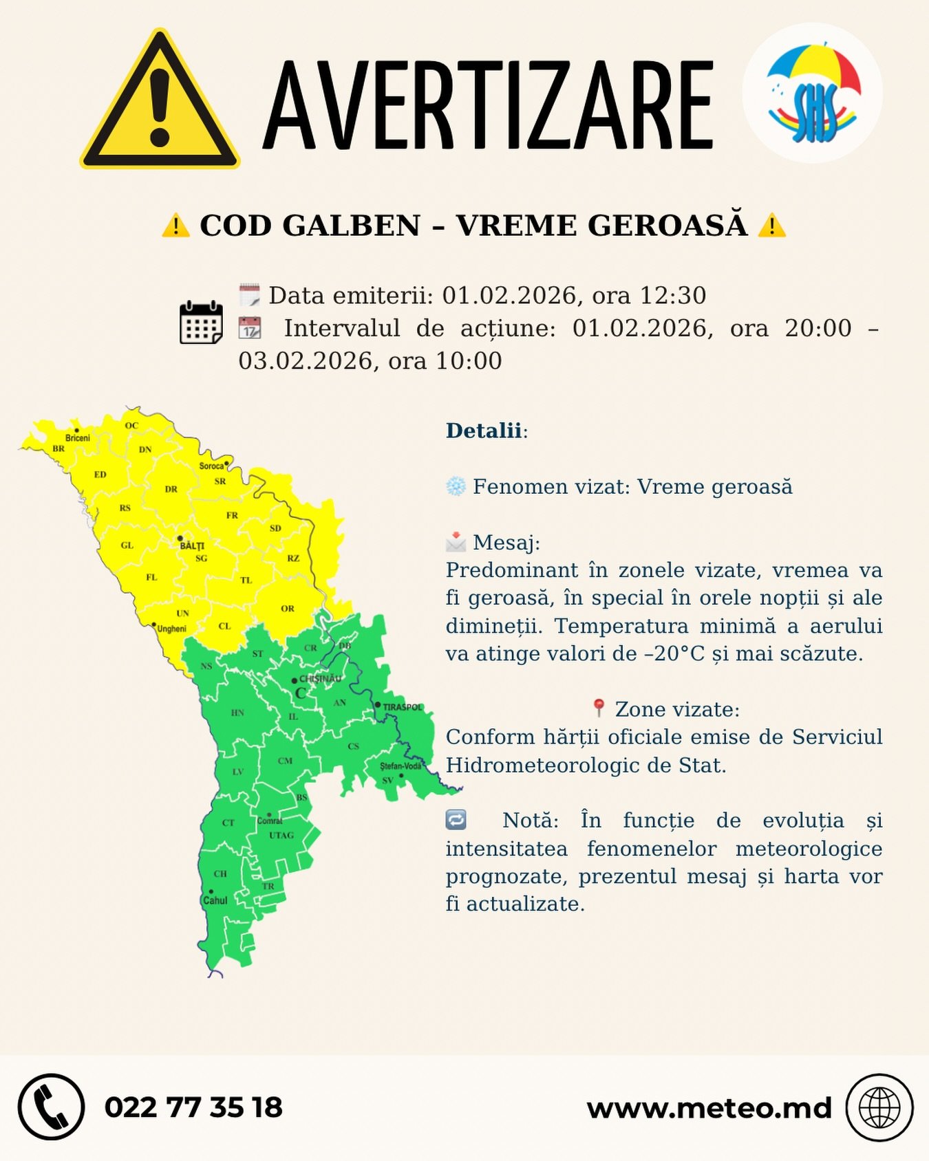 Serviciul Hidrometeorologic de Stat a emis o nouă avertizare – Cod Galben de vreme geroasă – valabilă în intervalul 1 februarie 2026 (ora 20:00 – 3 februarie 2026 (ora 10:00). Avertizarea vizează predominant zonele din nordul Republicii Moldova (vezi harta), unde vremea va fi geroasă, în special în orele nopții și ale dimineții. Temperatura minimă a aerului va atinge valori de –20°C și mai scăzute!