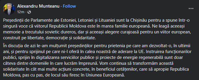 Premierul Republicii Moldova, Alexandru Munteanu, a avut o întrevedere cu președinții parlamentelor din Estonia, Letonia și Lituania. Potrivit unei postări publicate de șeful Executivului, discuțiile au avut loc în contextul vizitei oficialilor baltici la Chișinău, aceștia venind „pentru a spune într-o singură voce că viitorul Republicii Moldova este în marea familie europeană”.