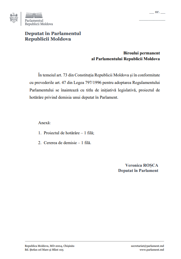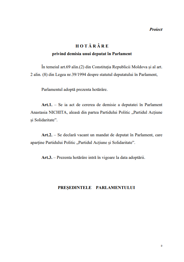 Deputata Anastasia Nichita a depus oficial cererea de demisie din Parlament, după ce, pe 26 ianuarie, a explicat public motivele renunțării la mandat. Documentul a fost înregistrat la 3 februarie 2026, iar Biroul permanent al Parlamentul Republicii Moldova a înaintat proiectul de hotărâre prin care este constatată vacanța mandatului de deputat pe lista PAS.