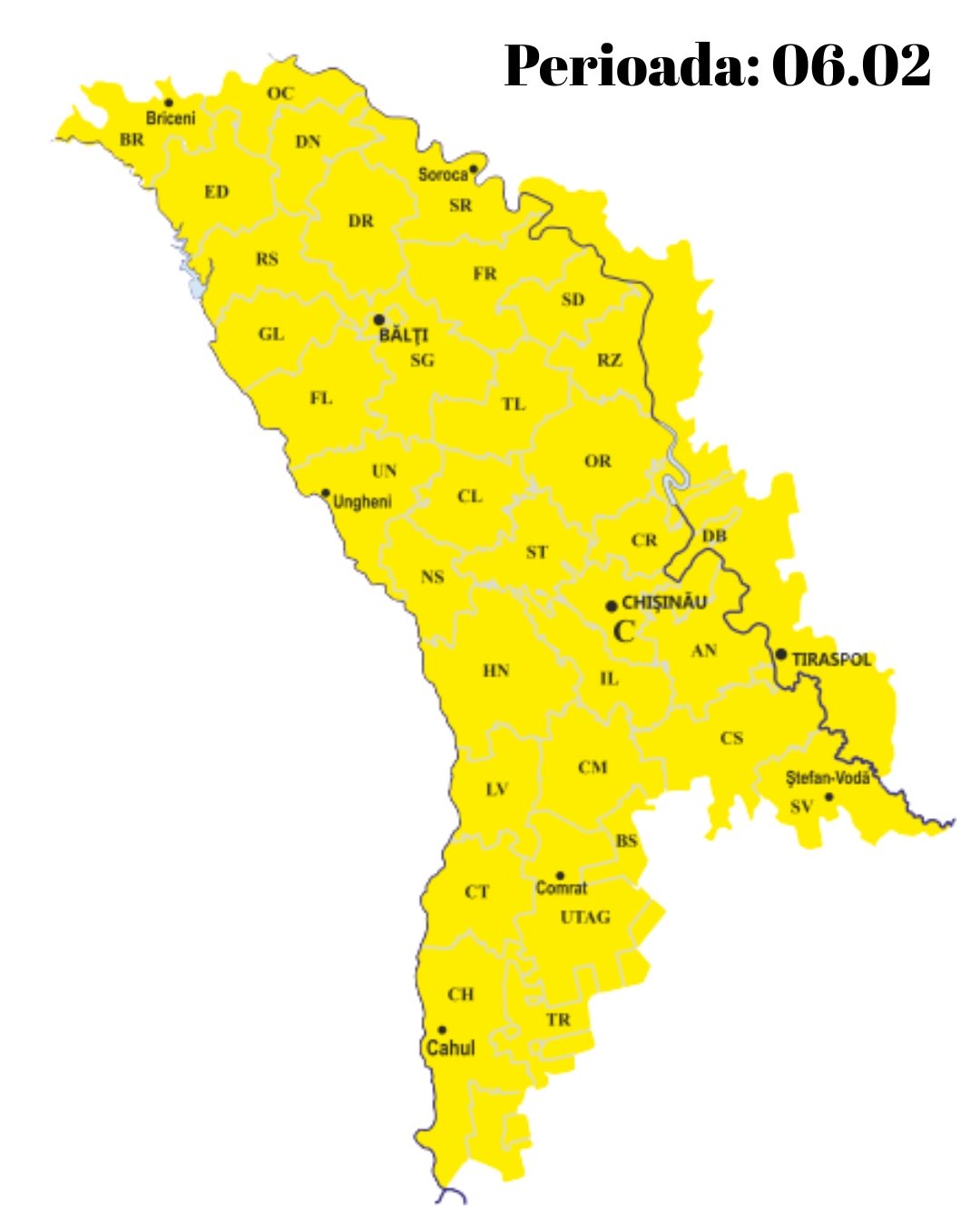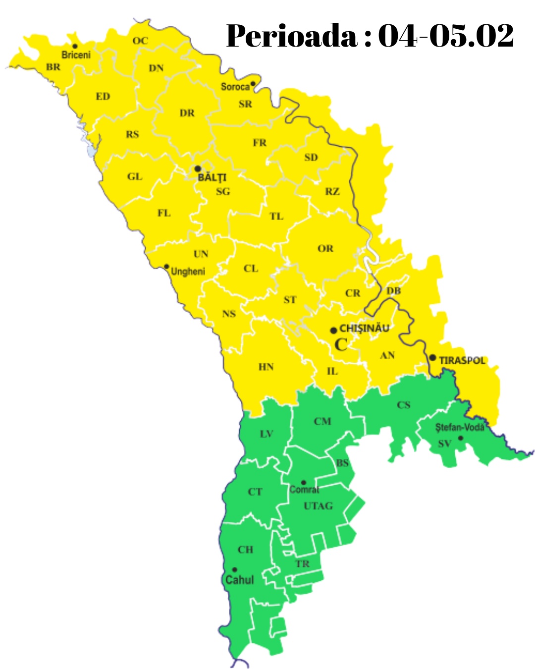 Serviciul Hidrometeorologic de Stat a emis o avertizare Cod Galben de polei și ghețuș, valabilă în intervalul 4 februarie (ora 19:00) – 6 februarie 2026 (ora 20:00). Fenomenul este cauzat de temperaturi în jur de 0°C asociate cu precipitații, predominant sub formă de ploaie, care vor favoriza formarea poleiului și ghețușului pe carosabil.
