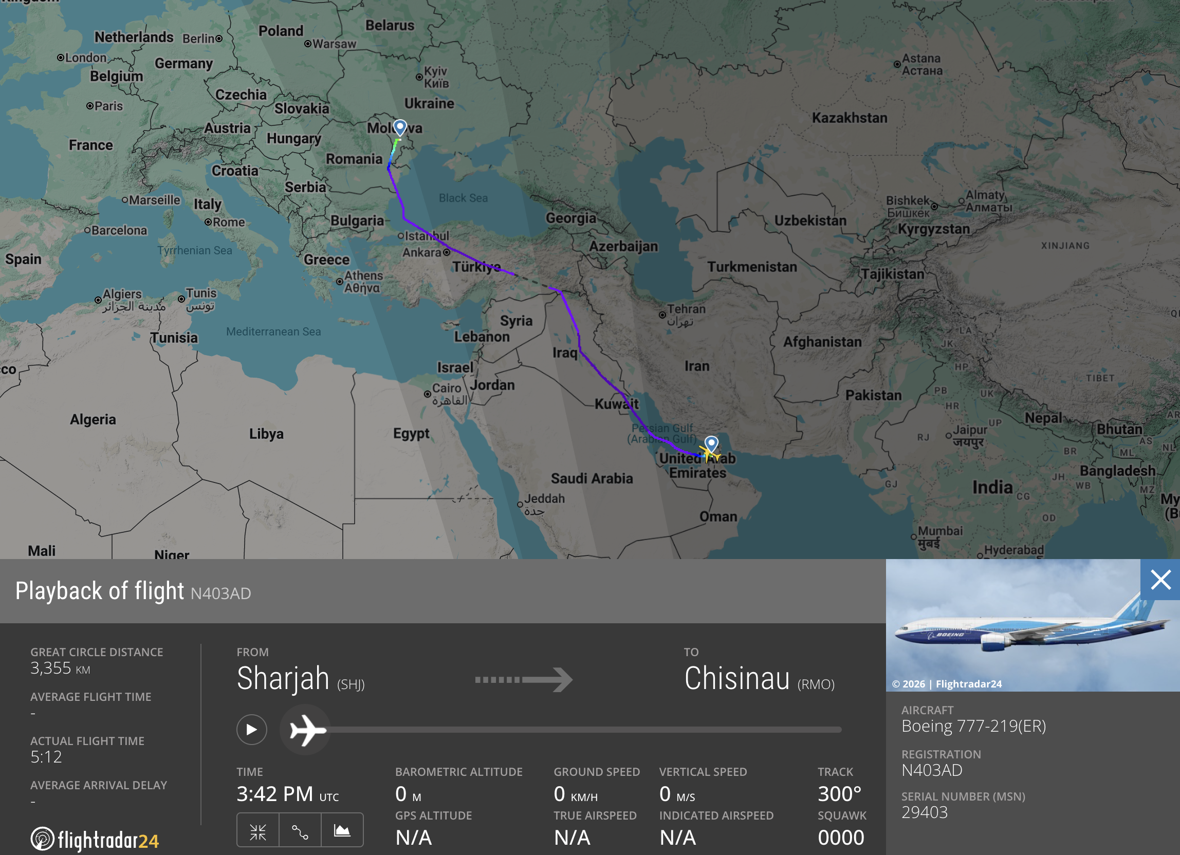 Unul dintre cele mai mari și cele mai renumite avioane wide body din lume, de fapt cel mai mare cu două motoare, a aterizat aproape de miezul nopții la Chișinău după ce a efectuat un zbor de 5 ore și 12 minute decolând de pe aeroportul Sharjah din Emiratele Arabe Unite.