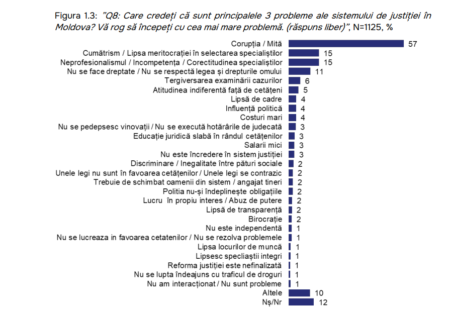 Întrebați care sunt principalele trei probleme ale sistemului de justiție, 57% dintre respondenți au spus că e corupția/mita, urmată de „cumătrism”/lipsa meritocrației și neprofesionalismul specialiștilor (câte 15%).