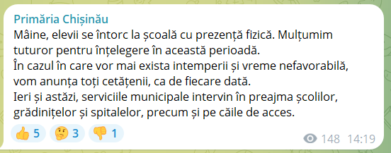 Municipalitatea recomandă elevilor, părinților și cadrelor didactice să manifeste prudență în deplasările către instituțiile de învățământ și să respecte indicațiile serviciilor responsabile.