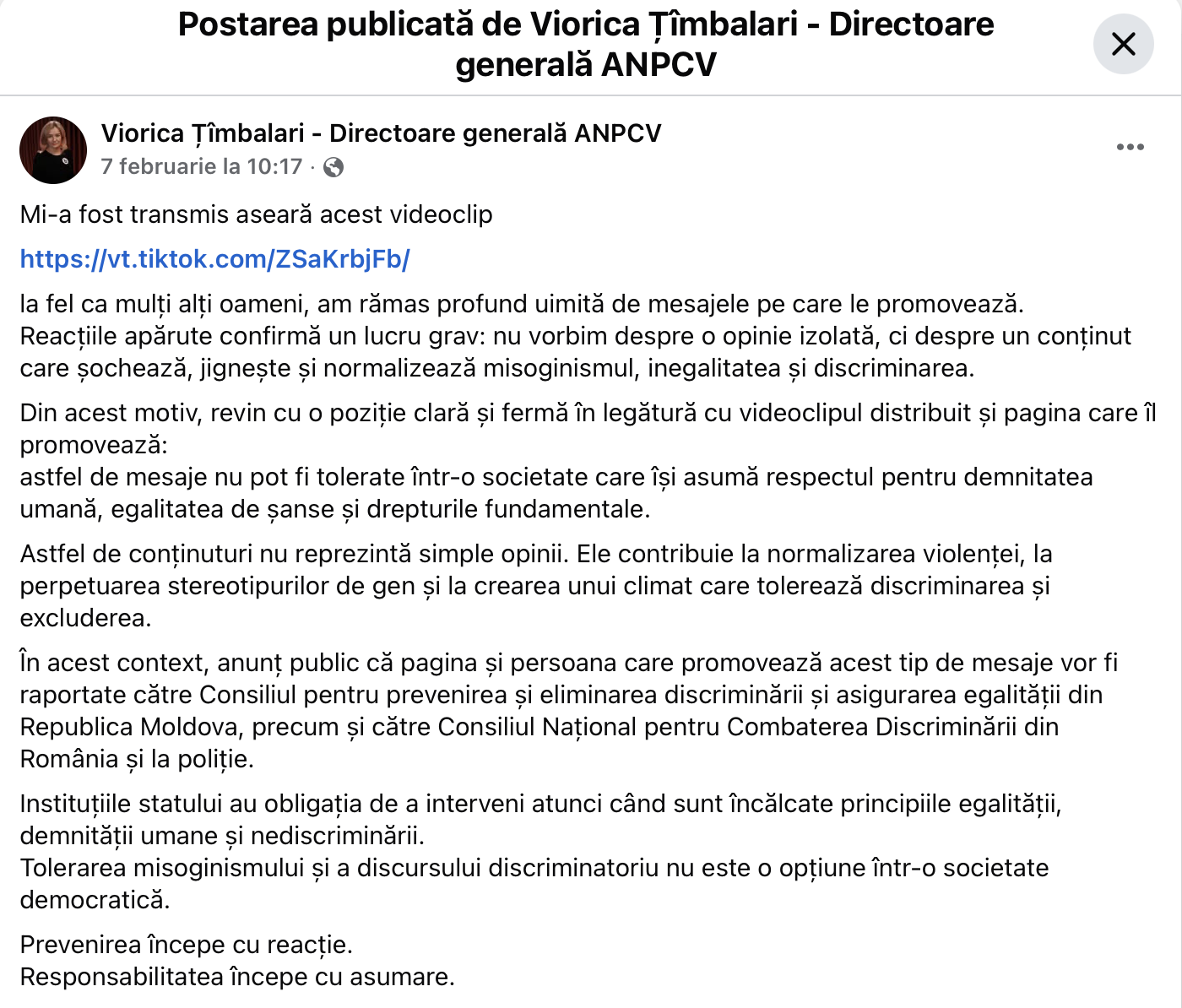„Astfel de conținuturi nu reprezintă simple opinii. Ele contribuie la normalizarea violenței, la perpetuarea stereotipurilor de gen și la crearea unui climat care tolerează discriminarea și excluderea. În acest context, anunț public că pagina și persoana care promovează acest tip de mesaje vor fi raportate către Consiliul pentru prevenirea și eliminarea discriminării și asigurarea egalității din Republica Moldova, precum și către Consiliul Național pentru Combaterea Discriminării din România și la poliție. Instituțiile statului au obligația de a interveni atunci când sunt încălcate principiile egalității, demnității umane și nediscriminării”, a anunțat Țîmbalari pe rețelele de socializare.