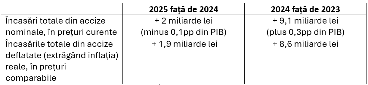 La accize situația stă și mai rău. Nu numai că nu s-a încasat în plus partea din cele 3,4 miliarde lei estimate anualizat din creșterea accizelor în 2025, dar încasările totale reale din accize realizate suplimentar au fost de 4,5 ori mai mici față de cel realizate în perioada anterioară. Consumul s-a restrâns, probabil că evaziunea a crescut.