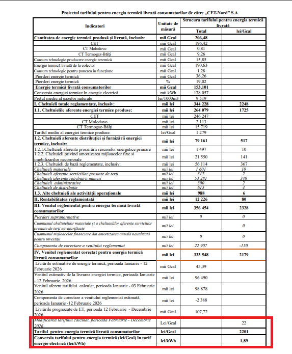 La Bălți tariful la energia termică va crește cu 75 de lei. ANRE propun un preț de 2201 lei/Gcal, față de 2359 lei/Gcal, cât a cerut CET-Nord. În prezen cetățenii chită 2 126 lei/Gcal.