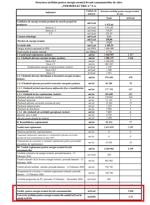 Tariful propus de ANRE este cu 160 de lei mai mic, decât cel solicitat de Termoelectrica SA. În prezent, tariful este de 2.510 lei/Gcal.
