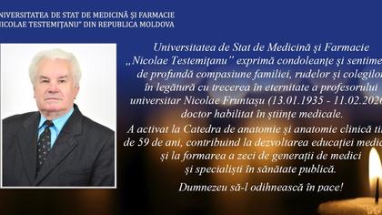 Doliu în comunitatea Universității de Medicină și Farmacie Nicolae Testemițanu. Profesorul universitar Nicolae Fruntașu, doctor habilitat în științe medicale, a trecut în eternitate. Instituția a transmis un mesaj de condoleanțe familiei, rudelor și colegilor răposatului.