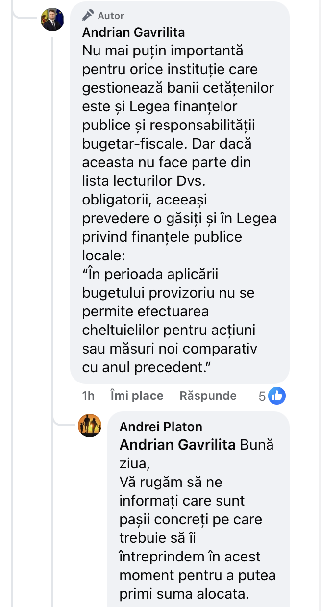 „Nu mai puțin importantă pentru orice instituție care gestionează banii cetățenilor este și Legea finanţelor publice şi responsabilităţii bugetar-fiscale. Dar dacă aceasta nu face parte din lista lecturilor Dvs. obligatorii, aceeași prevedere o găsiți și în Legea privind finanțele publice locale. În perioada aplicării bugetului provizoriu nu se permite efectuarea cheltuielilor pentru acțiuni sau măsuri noi comparativ cu anul precedent”, a comentat Gavrilița.