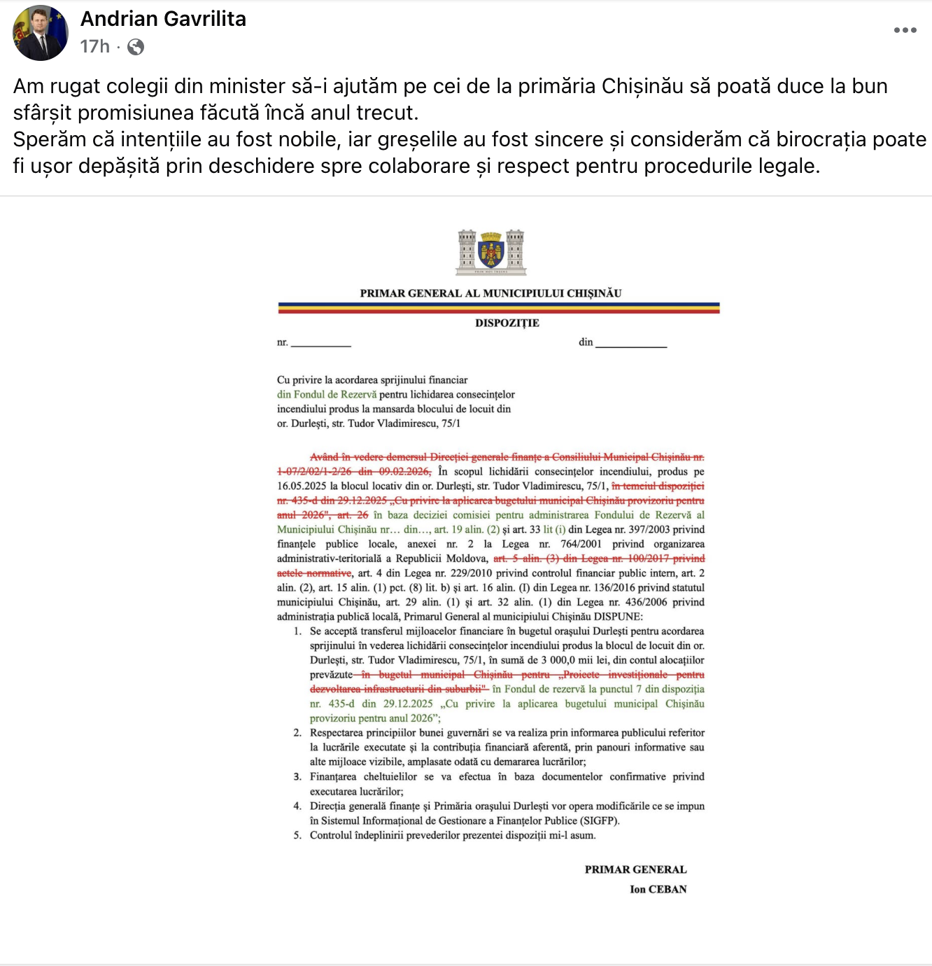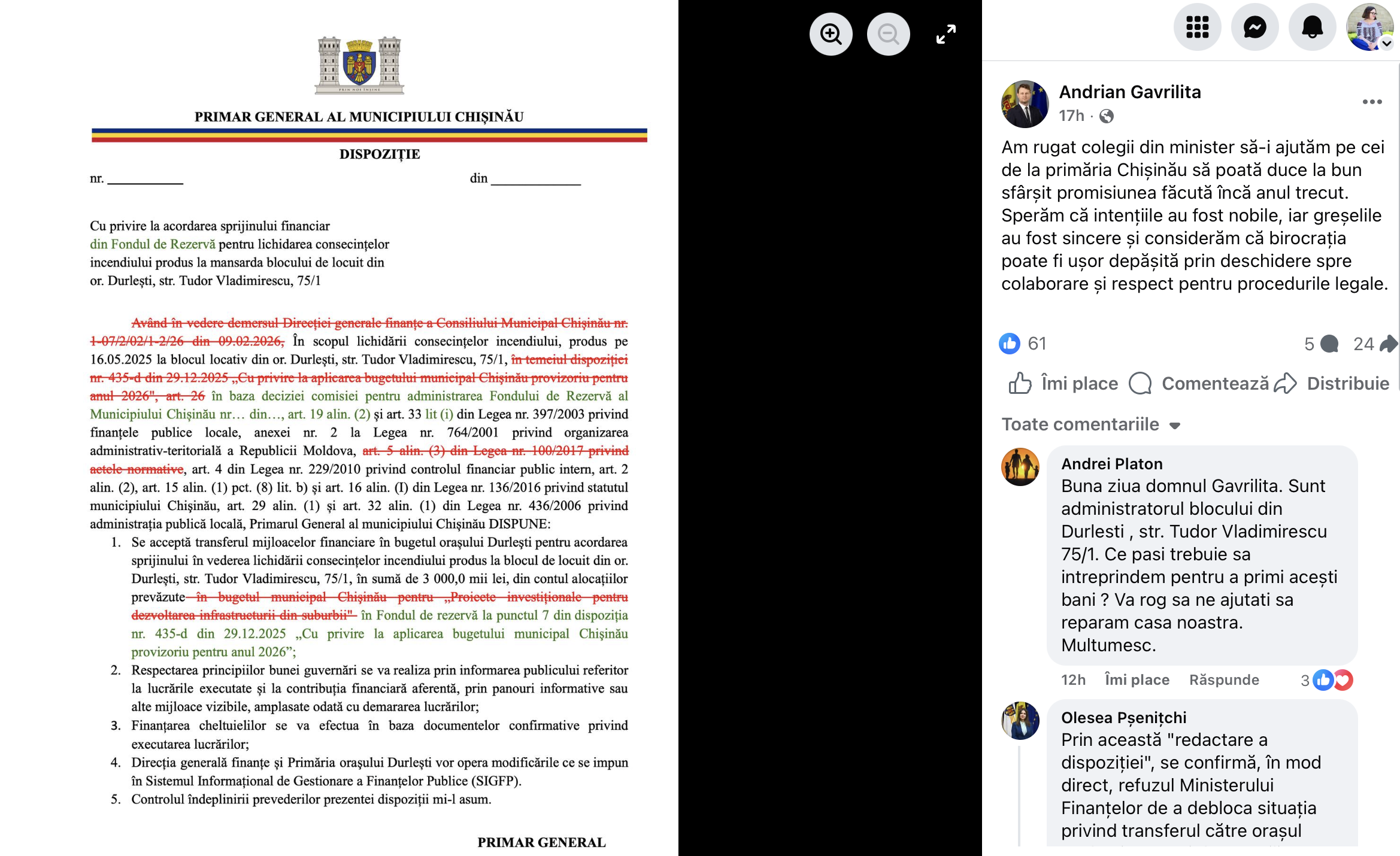 Ministrul Finanțelor Andrian Gavrilița a publicat pe Facebook un decret redactat al primarului Ion Ceban, referitor la alocarea banilor pentru blocul din Durlești, afectat de incendiu. Șefa Direcției Finanțe, desemnată viceprimară, Olesea Pșenițchi, afirmă că gestul oficialului înseamnă blocarea fondurilor.