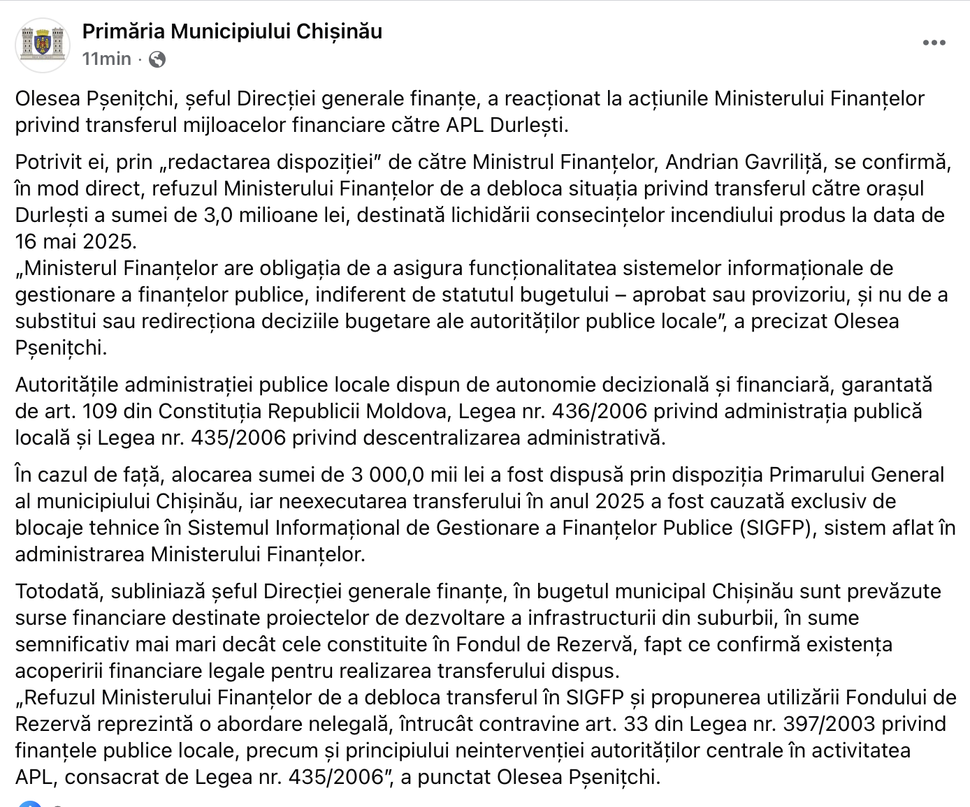 „În cazul de față, alocarea sumei de 3 000,0 mii lei a fost dispusă prin dispoziția Primarului General al municipiului Chișinău, iar neexecutarea transferului în anul 2025 a fost cauzată exclusiv de blocaje tehnice în Sistemul Informațional de Gestionare a Finanțelor Publice (SIGFP), sistem aflat în administrarea Ministerului Finanțelor. Totodată, subliniez că în bugetul municipal Chișinău sunt prevăzute surse financiare destinate proiectelor de dezvoltare a infrastructurii din suburbii, în sume semnificativ mai mari decât cele constituite în Fondul de Rezervă, fapt ce confirmă existența acoperirii financiare legale pentru realizarea transferului dispus. Refuzul Ministerului Finanțelor de a debloca transferul în SIGFP și propunerea utilizării Fondului de Rezervă reprezintă o abordare nelegală, întrucât contravine art. 33 din Legea nr. 397/2003 privind finanțele publice locale, precum și principiului neintervenției autorităților centrale în activitatea APL, consacrat de Legea nr. 435/2006”, a scris Pșenițchi.