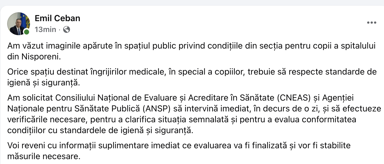 „Orice spațiu destinat îngrijirilor medicale, în special a copiilor, trebuie să respecte standarde de igienă și siguranță”, mai notează Ceban.