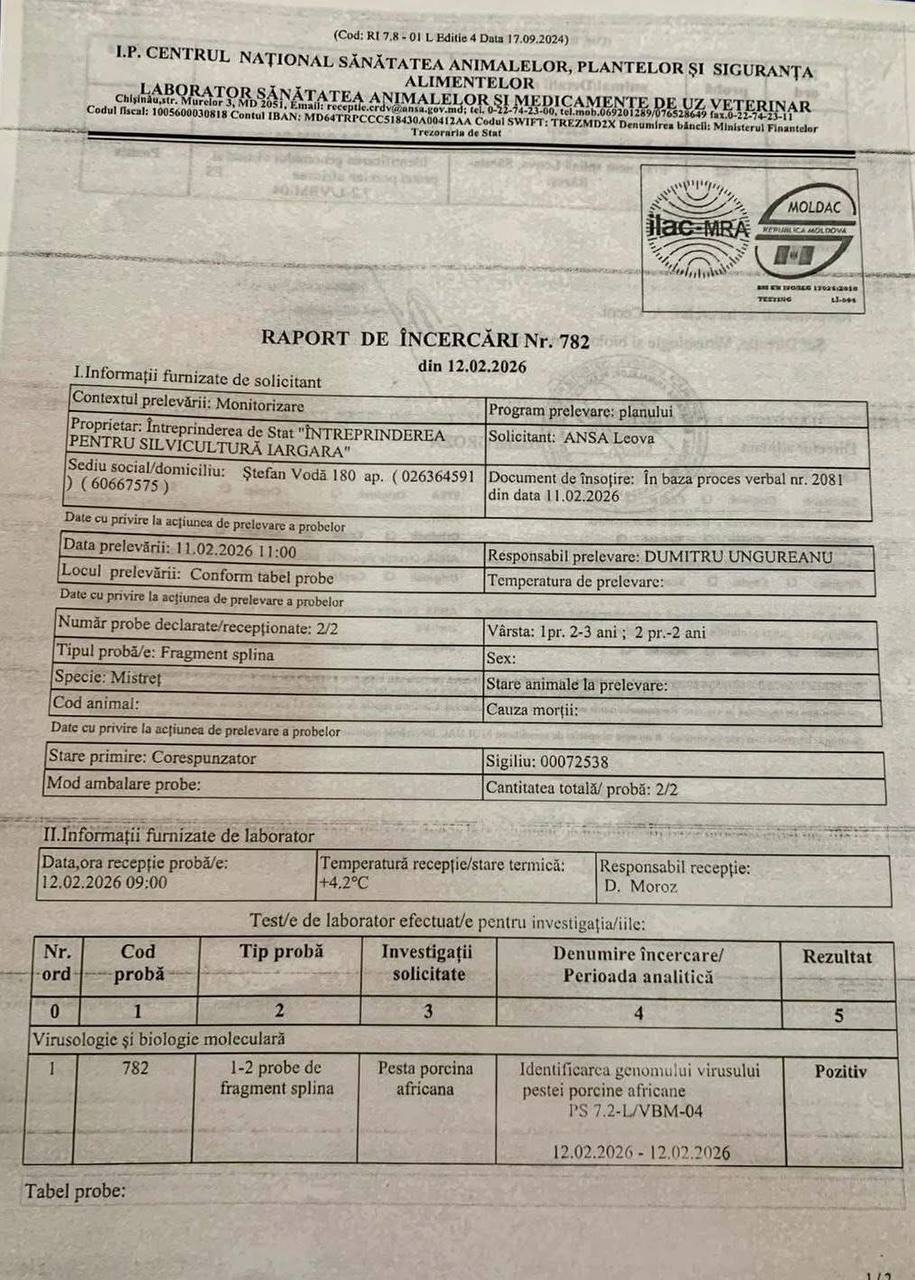 Precizăm că, pe 11 februarie 2026, silvicultorii din Iargara au fost anunțați despre depistarea a trei mistreți morți în extravilanul localității Sărată Răzeși, în apropierea râului Prut. În urma verificărilor din zonă, au mai fost găsiți alți trei mistreți morți, iar perimetrul a fost securizat și cazul raportat autorităților competente.