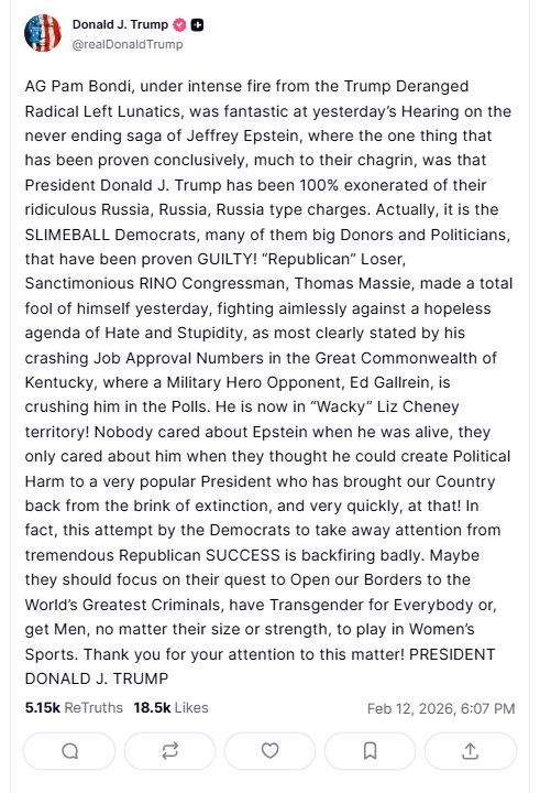 Ulterior, Președintele Donald Trump a reacționat pe platforma sa socială, lăudând prestația lui Bondi în fața comisiei.