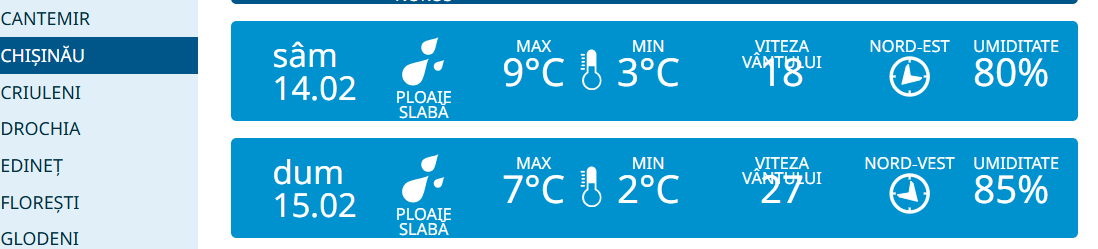 Pe 16 februarie, noaptea, izolat va ninge slab. Temperaturile vor scădea treptat: minimele de la 0…+5°C până la −8…−3°C, iar maximele de la +7…+12°C până la −3…+2°C.