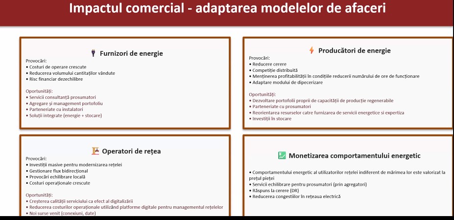 „Existența prosumatorilor pe piața internă de energie are multe efecte benefice. Prosumatorii contribuie la modernizarea sistemului energetic prin: creșterea ponderii energiei regenerabile; potențialul de a participa la servicii de echilibrare prin agregare și stocare; accelerarea digitalizării și adoptării de tehnologii noi. Totuși, această evoluție impresionantă a perturbat semnificativ activitatea în sector, mai ales pentru că s-a suprapus peste efectele crizei energetice și ale plafonării prețurilor. De aceea am solicitat acest studiu: pentru a evalua cât mai bine ce se întâmplă în piață, ce se întâmplă cu producția distribuită, la ce concluzii se ajunge și, mai ales, ce este de făcut în viitor”, a explicat reprezentantul furnizorilor.