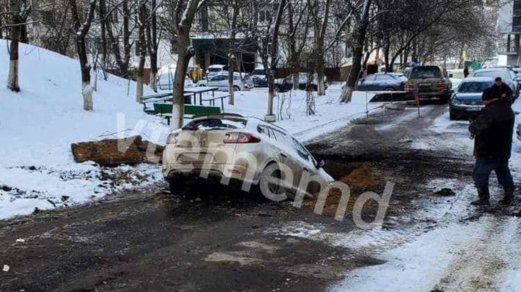 Așa ceva vezi rar în Chișinău! Un șofer și-a avariat mașina după ce a căzut într-o groapă adâncă de pe strada Milescu Spătaru.