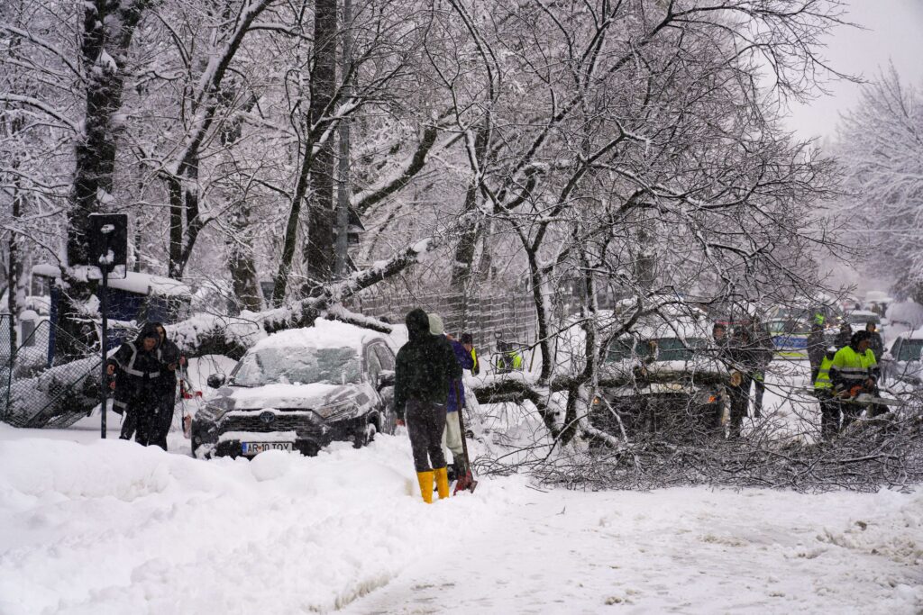 Haos în București după ninsoare: 183 de copaci rupți, zeci de mașini avariate și un microbuz blocat în zăpadă. VIDEO