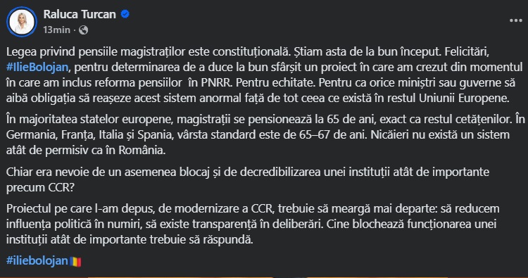 Raluca Turcan a descris noua lege ca fiind un pas necesar spre echitate socială. „Legea privind pensiile magistraților este constituțională. Știam asta de la bun început”, a afirmat aceasta, felicitându-l pe Ilie Bolojan pentru perseverența de a implementa o reformă care corectează anomaliile din sistemul românesc.