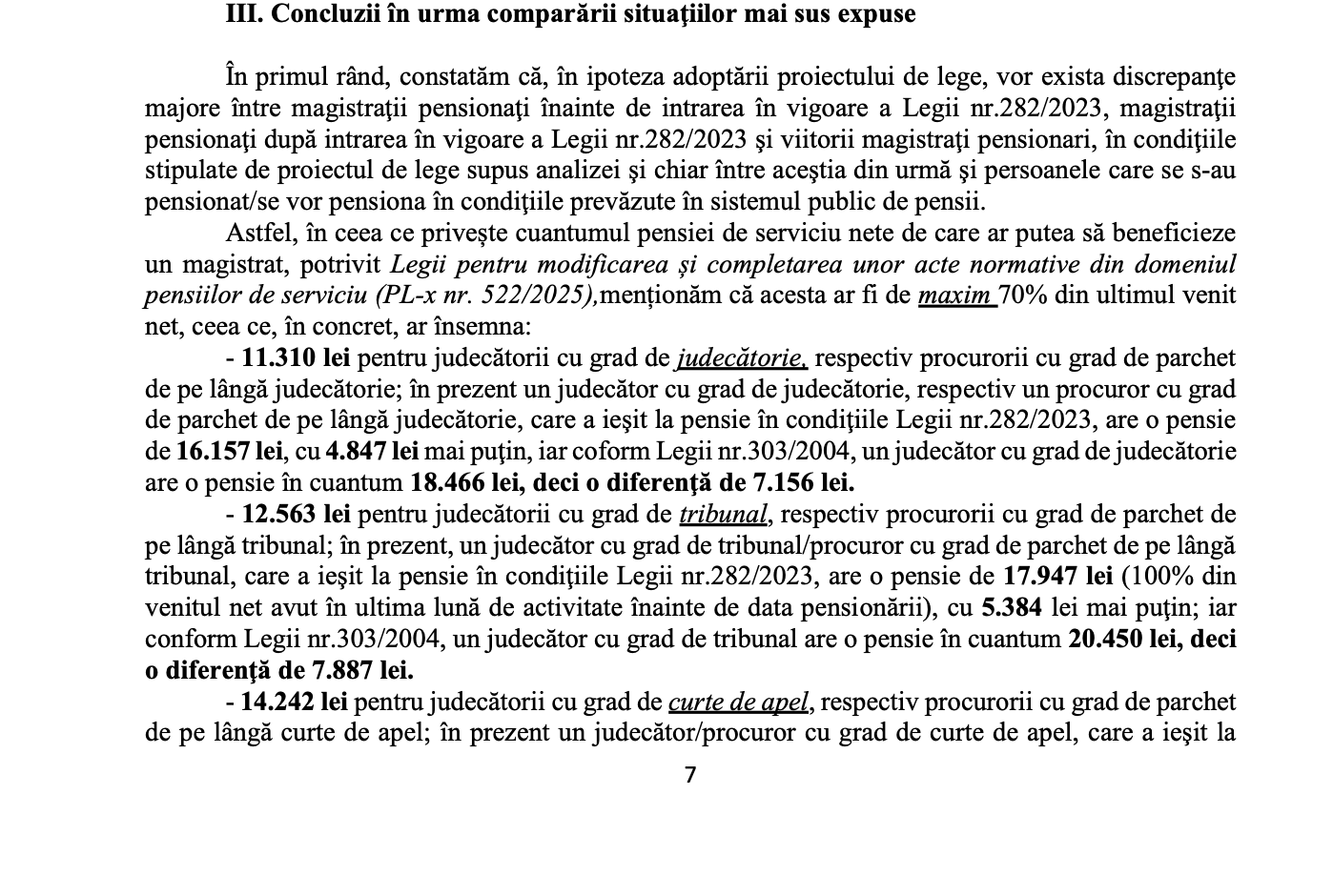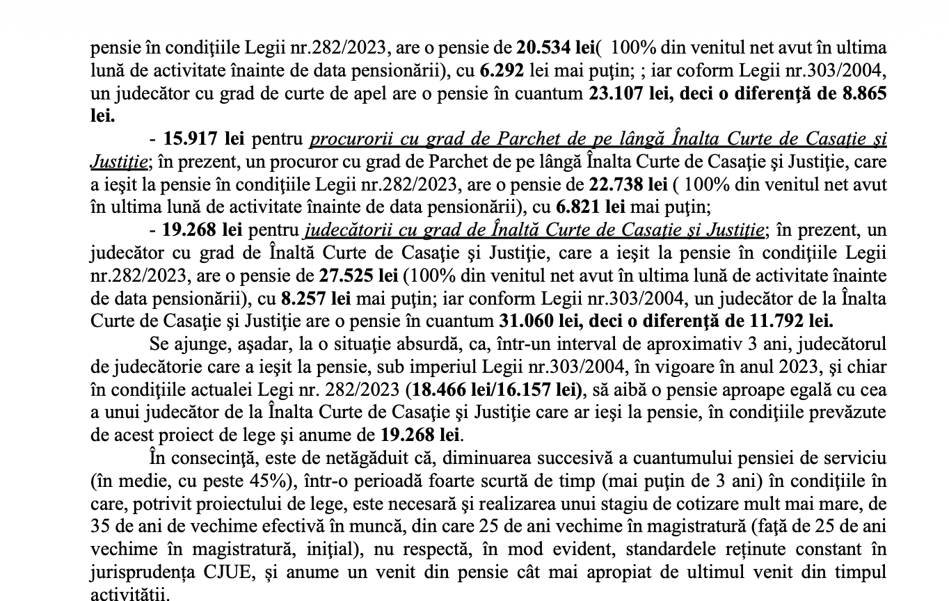 El mai arată că nici prin prisma cuantumului pensiei de serviciu – prin raportare la beneficiarii principali – militarii și polițiștii – nici așa nu se justifică discriminarea magistraților în raport cu celelalte categorii profesionale.