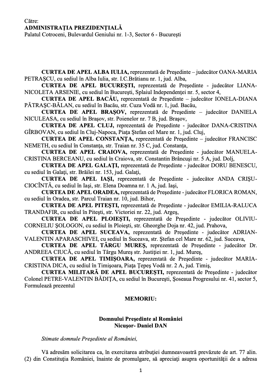 Ca atare, șefii celor 16 curți de Apel din România îi cer lui Nicușor Dan să fie ancorat în realitate, să respecte criteriile de legalitate, de armonizare a legislației interne cu cea europeană și cu tratatele/ jurisprudența CEDO și să trimită legea lui Ilie Bolojan la reexaminare Parlamentului României.