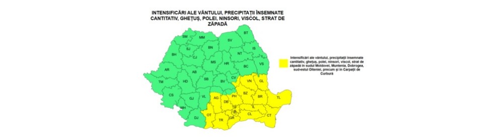Separat, informarea meteorologică emisă anterior rămâne valabilă pentru întreaga țară până duminică dimineața și vizează ninsori, polei, vânt și viscol la munte, cu rafale de 70-90 km/h la altitudini mari.