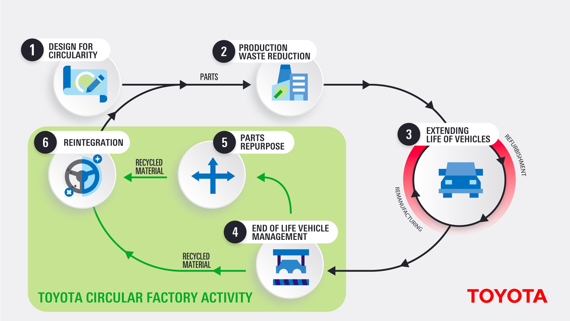 Circularitatea reprezintă atât o cale, cât și un facilitator esențial către neutralitatea emisiilor de carbon. Prin reducerea cererii de materii prime intens carbonice și întărirea lanțurilor de aprovizionare, Toyota contribuie la scăderea emisiilor pe întreg lanțul valoric. Proiectarea vehiculelor pentru reutilizare, recondiționare, reciclare și eficiență materială joacă un rol cheie în atingerea acestui obiectiv strategic.