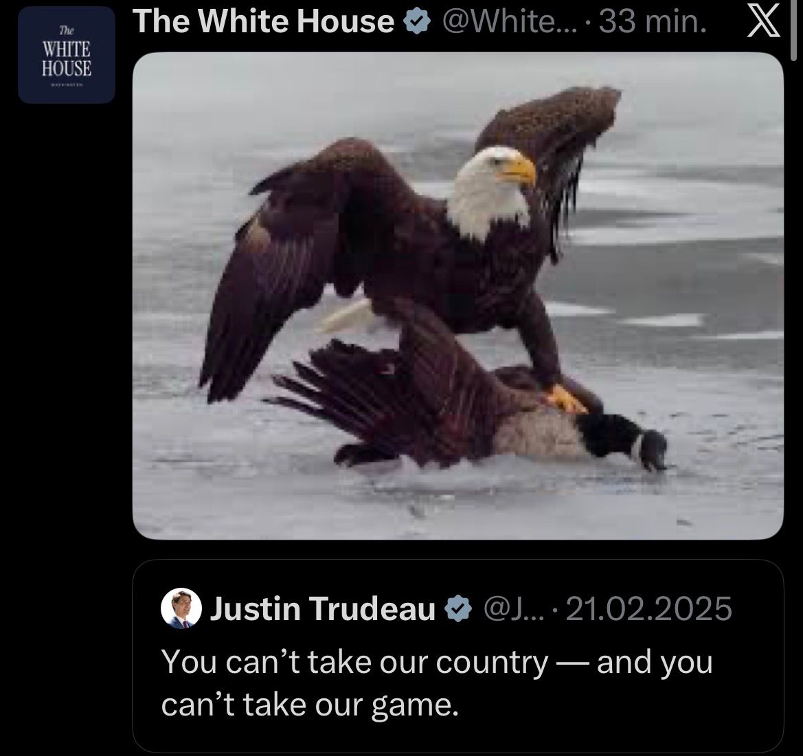 Casa Albă a răspuns la acea postare cu o imagine sugestivă, în care un vultur, simbol al SUA, apare deasupra unei gâște canadiene.