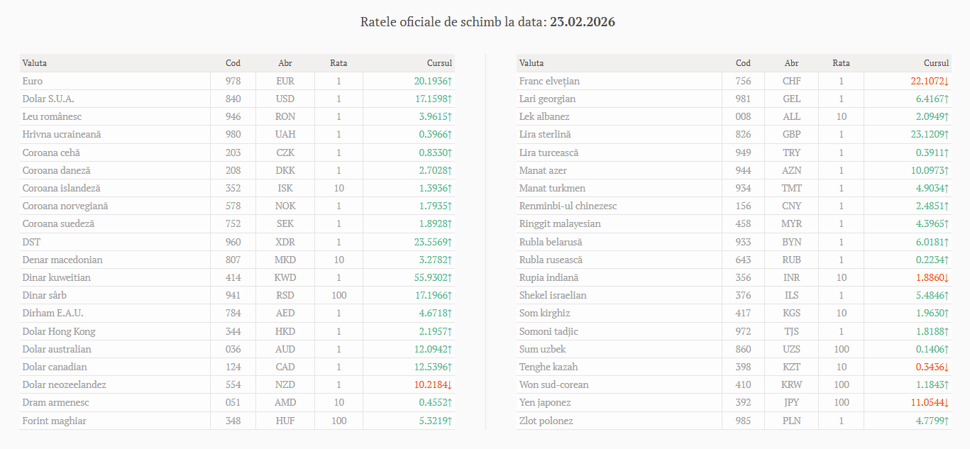 Banca Națională a Moldovei (BNM) a stabilit datele oficiale de schimb valutar pentru astăzi, 23 februarie.