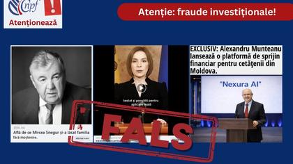 Comisia Națională a Pieței Financiare (CNPF) avertizează cetățenii cu privire la răspândirea, în mediul online și pe rețelele de socializare, a unor materiale publicitare înșelătoare, care imită identitatea vizuală a unor instituții mass-media și utilizează în mod abuziv numele și imaginea unor personalități publice (ex. Mircea Snegur, Maia Sandu, Alexandru Munteanu etc.), pentru a promova pretinse oportunități de „investiții” prin intermediul unor platforme frauduloase, precum „Harmony Bitspire” și „Nexura AI”.