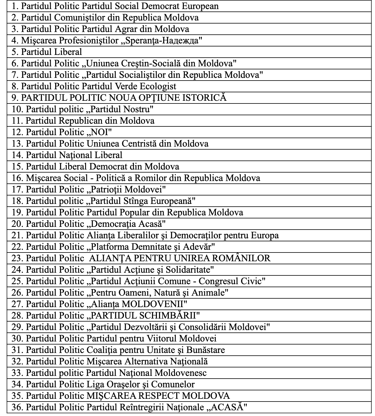 Drept urmare, cele 36 de partide menționate pot fi admise la scrutin, iar activitatea lor nu este limitată sau încetată.