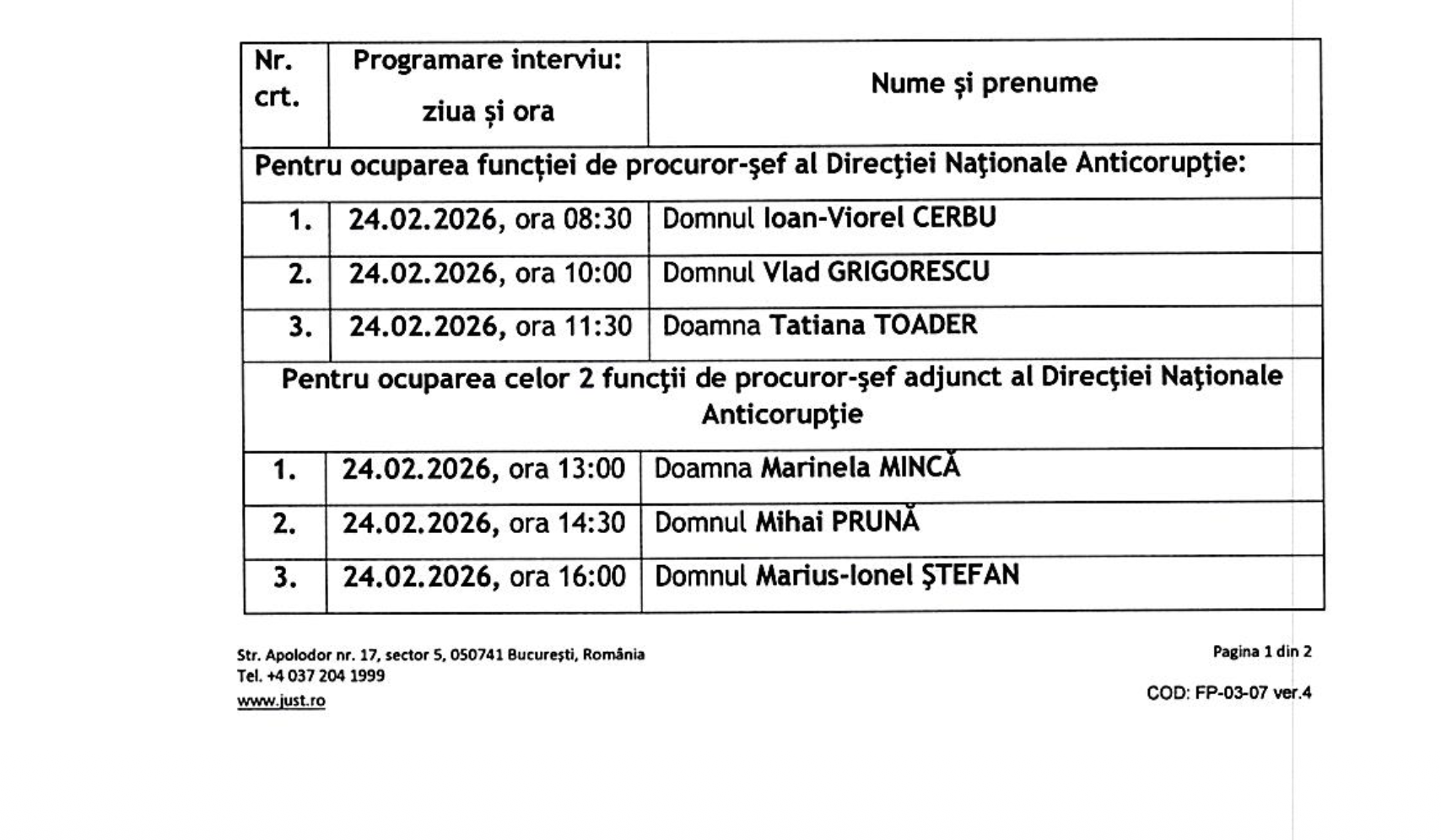 În perioada 23 și 26 februarie 2026 sunt susținute interviurile în fața comisiei de către candidații care s-au înscris pentru funcțiile de procuror șef și procuror șef adjunct al Parchetului General, DNA și DIICOT.