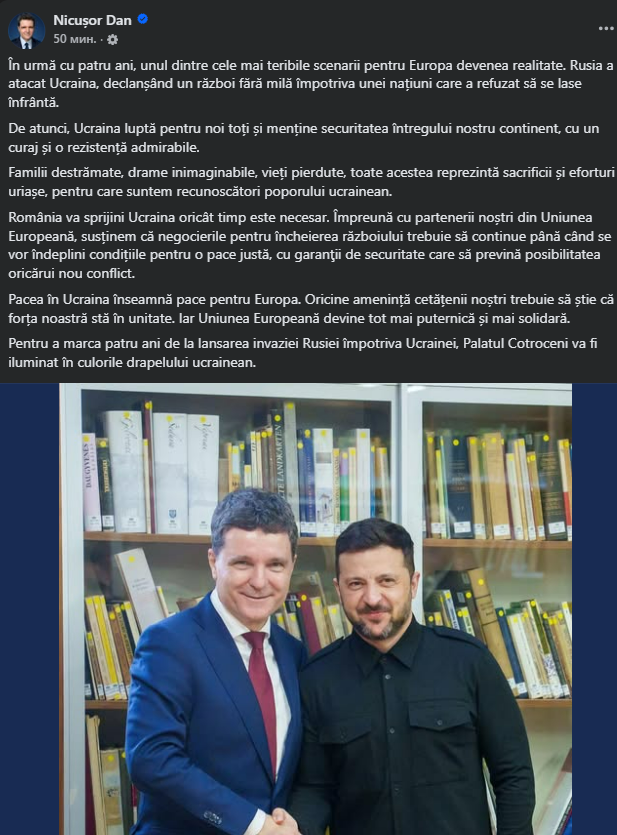„În urmă cu patru ani, unul dintre cele mai teribile scenarii pentru Europa devenea realitate. Rusia a atacat Ucraina, declanșând un război fără milă împotriva unei națiuni care a refuzat să se lase înfrântă. De atunci, Ucraina luptă pentru noi toți și menține securitatea întregului nostru continent, cu un curaj și o rezistență admirabile,” a scris Nicușor Dan.