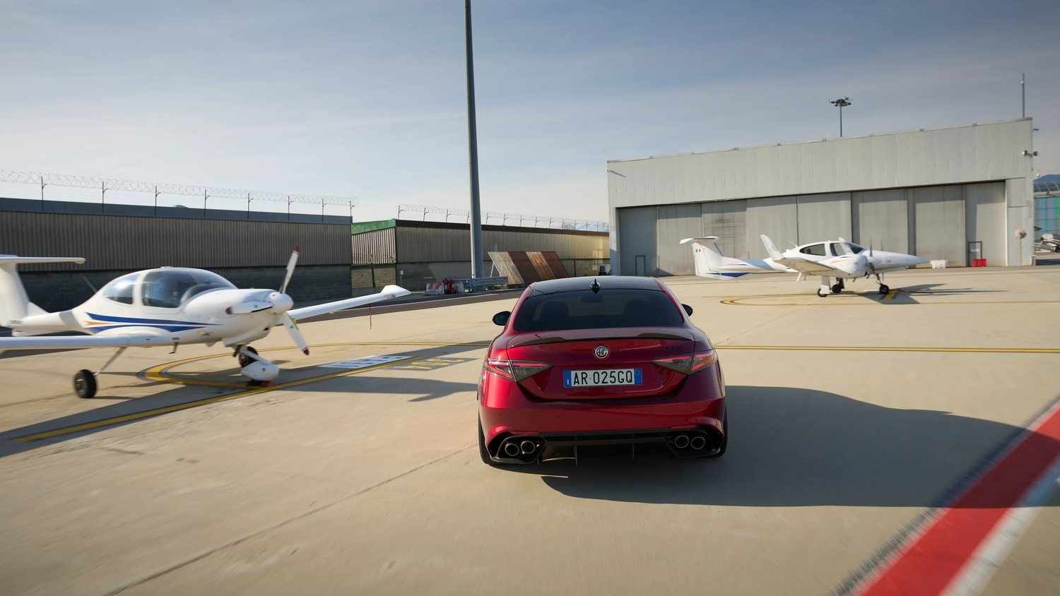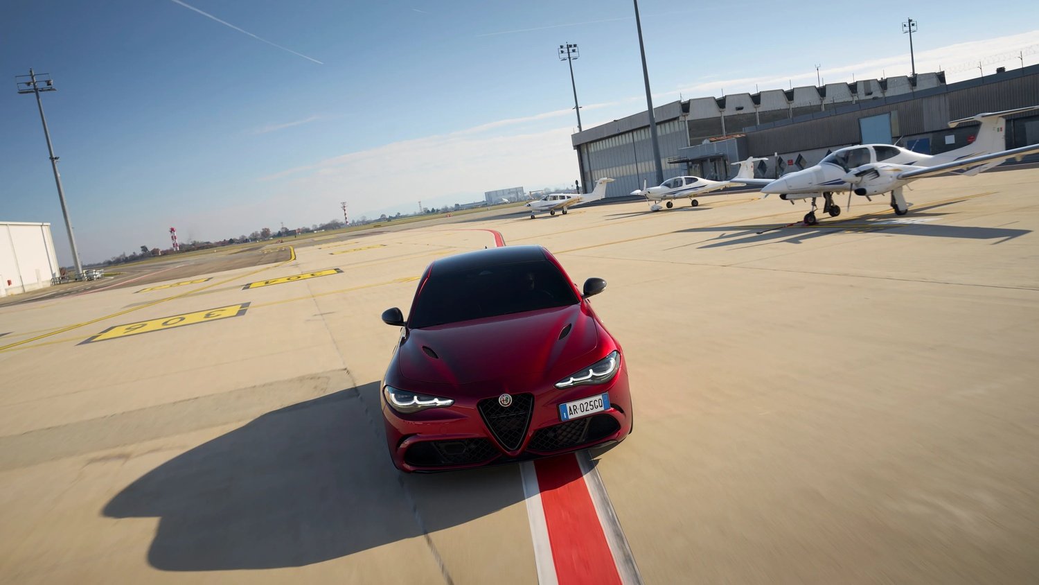 Aerodinamica activă a Giuliei include splitter-ul frontal din fibră de carbon, care reglează fluxul de aer sub vehicul pentru stabilitate și performanță sporită. Iar sistemul de eșapament Akrapovič oferă un sunet profund și inconfundabil, amplificând legătura emoțională dintre mașină și șofer.