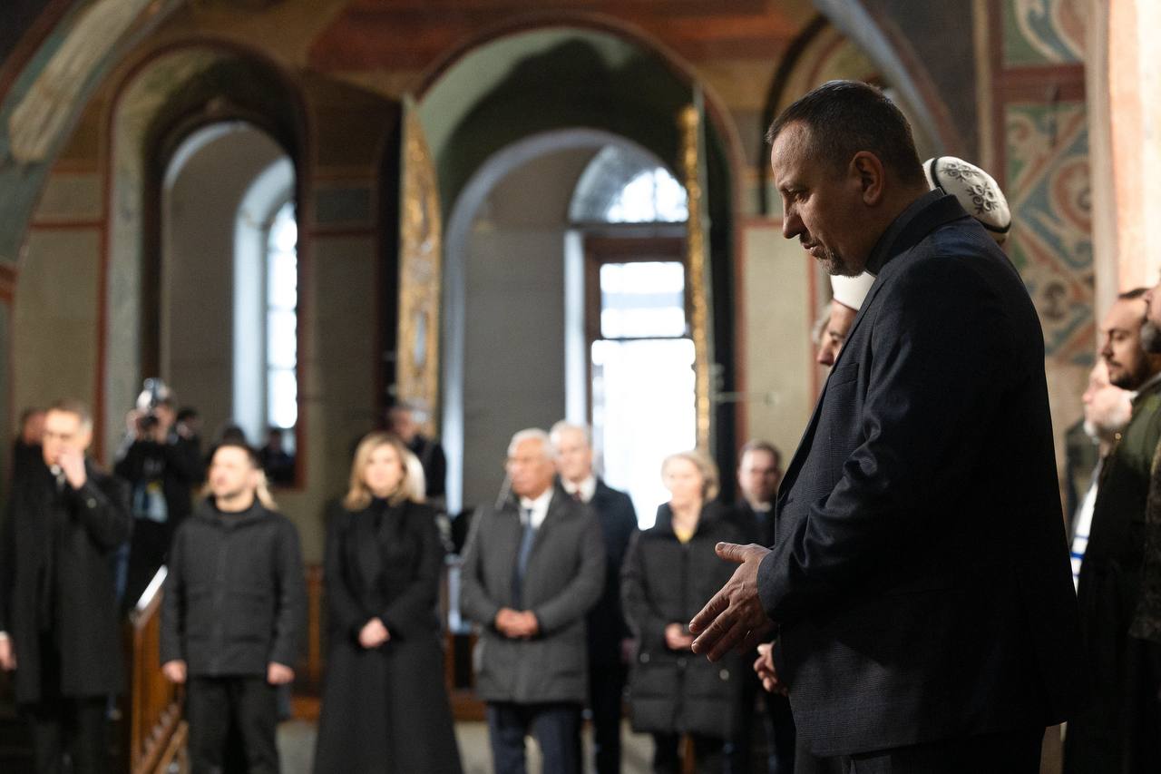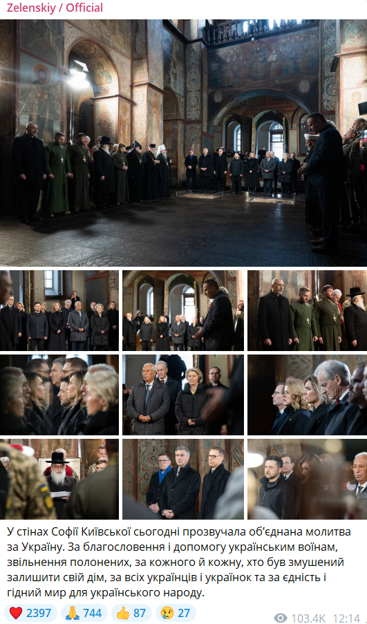 O rugăciune unitară pentru Ucraina a avut loc astăzi, 24 februarie, la Catedrala Sfânta Sofia din Kiev, la care au participat lideri europeni, alături de președintele Ucrainei, Volodimir Zelenski, și prima doamnă, Elena Zelenski. Zelenski a publicat imagini de la eveniment și a transmis un mesaj pentru soldații ucraineni, pentru eliberarea prizonierilor și pentru cei care au fost nevoiți să-și părăsească locuințele din cauza războiului.