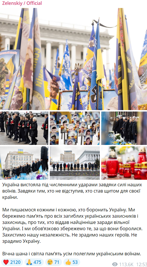 „Ucraina a îndurat numeroase lovituri datorită forței soldaților noștri. Mulțumim celor care nu s-au retras, care au devenit un scut pentru țara lor. Suntem mândri de fiecare persoană care apără Ucraina. Prețuim memoria tuturor apărătorilor ucraineni căzuți, a celor care au dat cel mai valoros lucru pentru o Ucraină liberă”, a declarat Volodimir Zelenski.