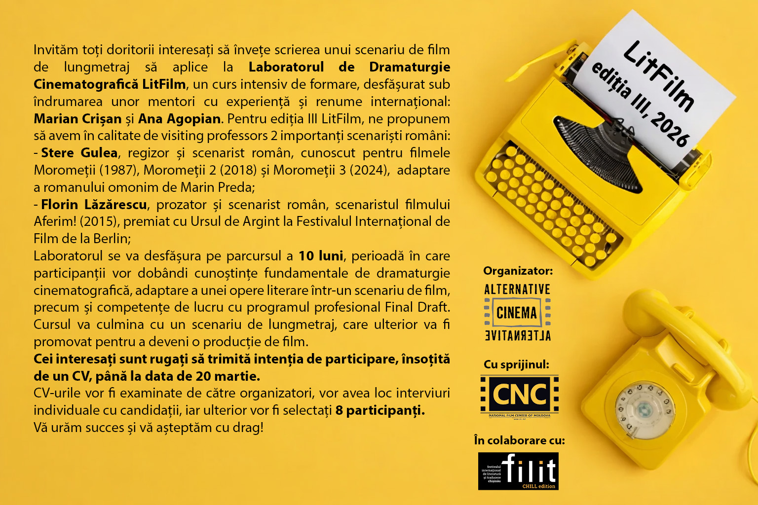 Autorii de romane din Republica Moldova și România sunt invitați să își înscrie operele pentru adaptare cinematografică, în cadrul Laboratorului de Dramaturgie Cinematografică LitFilm, ediția a treia, 2026.