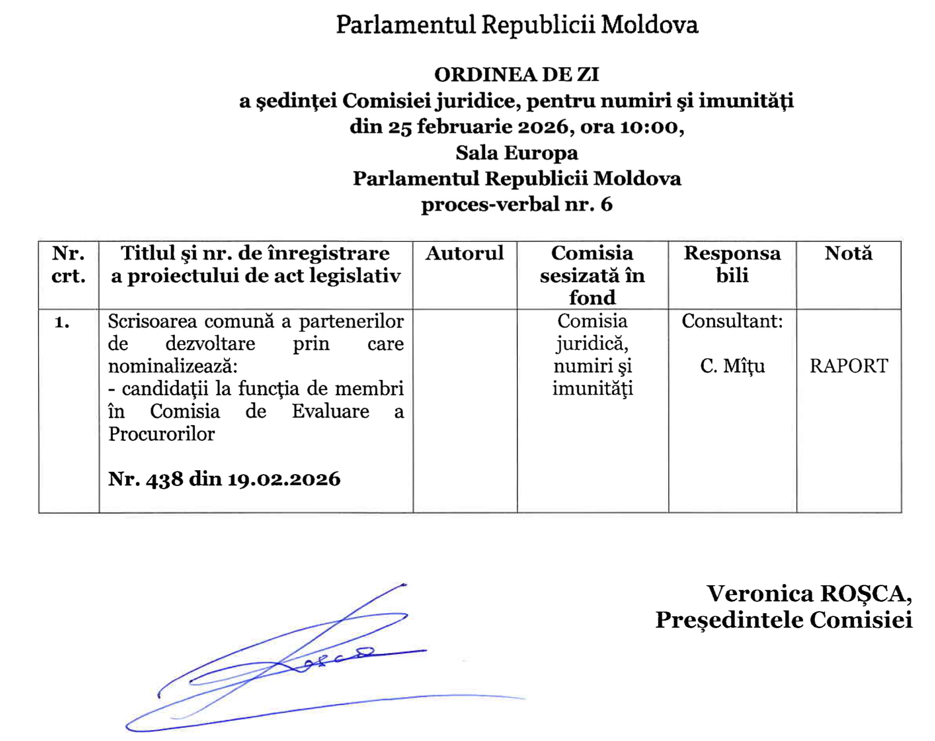 Pe agenda ședinței Comisiei juridice numiri și imunități, desfășurată în dimineața de 25 ianuarie, se numără subiectul. Redacția Realitatea a solicitat președintei Comisiei, deputatei PAS Veronica Roșca, să confirme sau să infirme declarațiile privind numirea lui von Hebel. Până la ora publicării știrii nu am primit un răspuns de la parlamentară.
