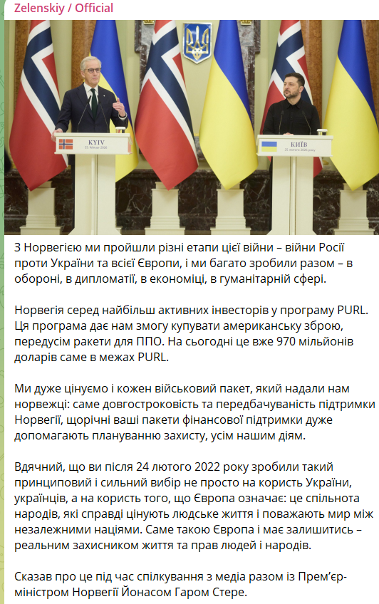 „Potrivit lui, Norvegia se numără printre cei mai activi investitori în programul PURL. Acest program ne permite să achiziționăm arme americane, în principal rachete de apărare aeriană. Astăzi, suma este deja de 970 de milioane de dolari în cadrul PURL”, a declarat președintele ucrainean.