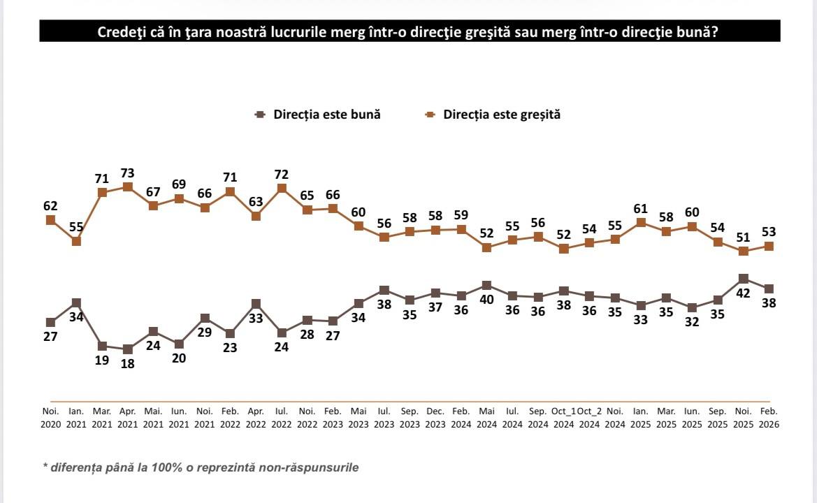Potrivit cercetării, 53% dintre respondenți cred că direcția este greșită, în timp ce 38% sunt de părere că lucrurile merg într-o direcție bună. Tendința se menține relativ stabilă în ultimele luni, cu fluctuații minore.