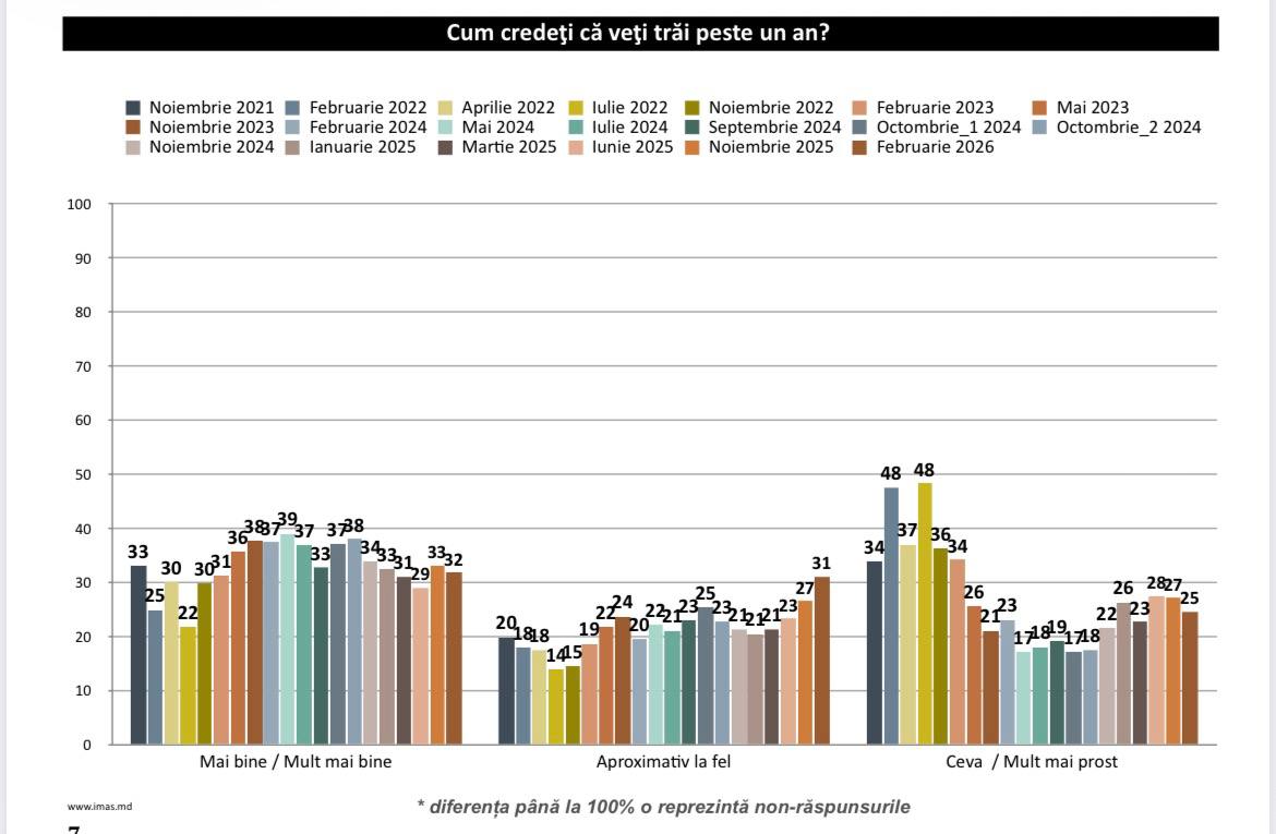 Sondajul IMAS a fost realizat în februarie 2026, pe un eșantion de 1.113 respondenți cu vârsta de peste 18 ani, pe teritoriul Republicii Moldova (fără regiunea transnistreană). Marja maximă de eroare este de ±3%.