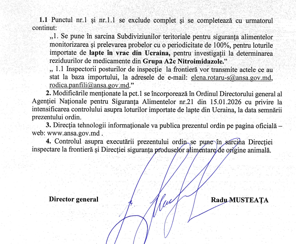 Actul exclude prevederile punctelor 1 și 1.1 din Ordinul nr. 21 din 15 ianuarie 2026 și introduce o nouă formulare. Potrivit documentului, „Se pune în sarcina Subdiviziunilor teritoriale pentru siguranța alimentelor monitorizarea și prelevarea probelor cu o periodicitate de 100%, pentru loturile importate de lapte în vrac din Ucraina, pentru investigații la determinarea reziduurilor de medicamente din Grupa A2c Nitroimidazole”.