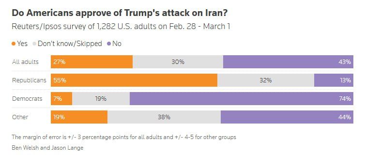 Potrivit unui sondaj Reuters/Ipsos, aproximativ 27% dintre respondenți au declarat că aprobă loviturile, 43% le dezaprobă, iar 29% nu sunt siguri.