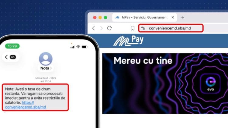 Guvernul Republicii Moldova avertizează asupra unei scheme de fraudă care utilizează ilegal identitatea MPay și EVO. Cetățenii care primesc mesaje privind o presupusă „taxă de drum restantă” și sunt îndemnați să acceseze linkuri precum conveniencemd.sbs/md trebuie să știe că acestea nu aparțin Guvernului și reprezintă tentative de phishing, având scopul de a colecta fraudulos date personale și bancare.