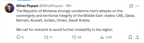 Într-o postare publicată pe rețelele sociale, oficialul a transmis: „Republica Moldova condamnă ferm atacurile Iranului asupra suveranității și integrității teritoriale ale statelor din Orientul Mijlociu: Emiratele Arabe Unite, Qatar, Bahrain, Kuweit, Iordania, Oman, Arabia Saudită. Facem apel la reținere pentru a evita o instabilitate suplimentară în regiune”.