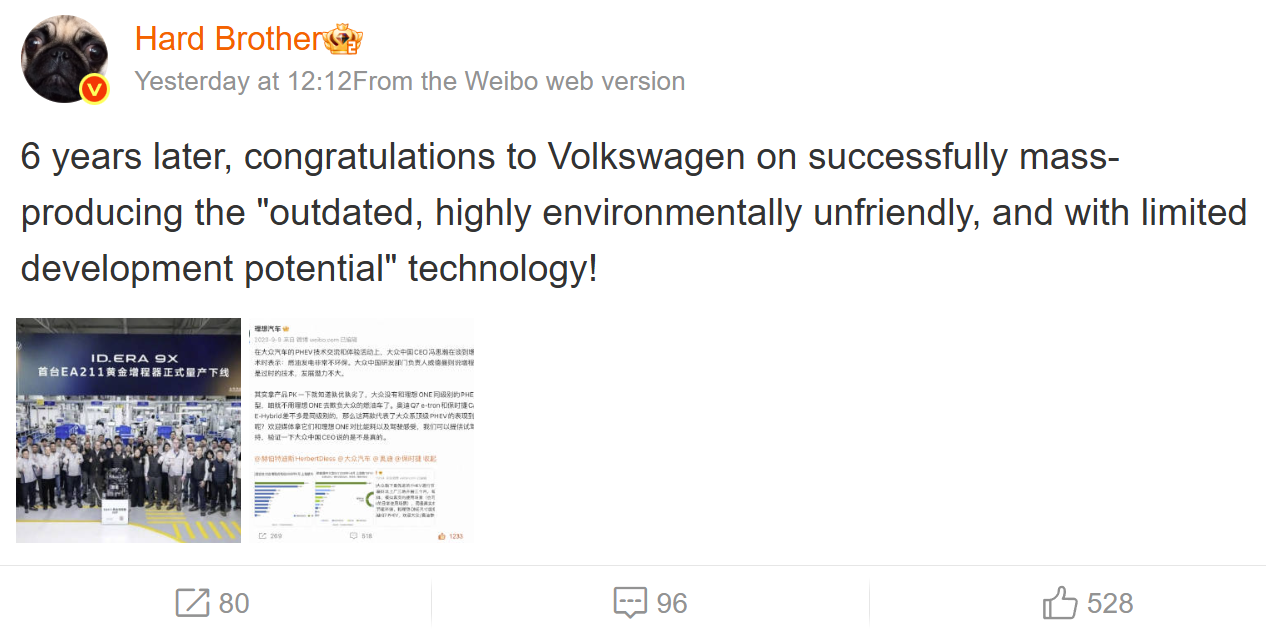 Reacția Li Auto nu a întârziat să apară. Directorul de social media al departamentului de PR al Li Auto a scris pe platforma Weibo: „Felicitări Volkswagen pentru că a reușit să producă în serie, în doar 6 ani, o tehnologie învechită, foarte neprietenoasă cu mediul și cu puțin potențial de dezvoltare!”